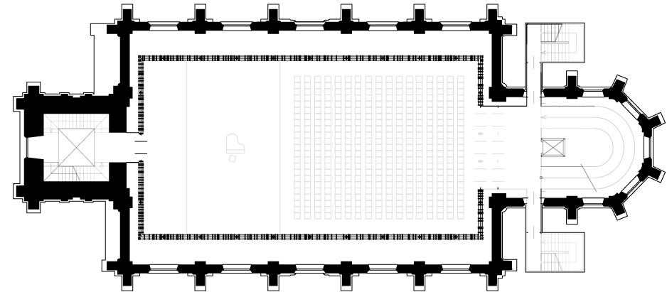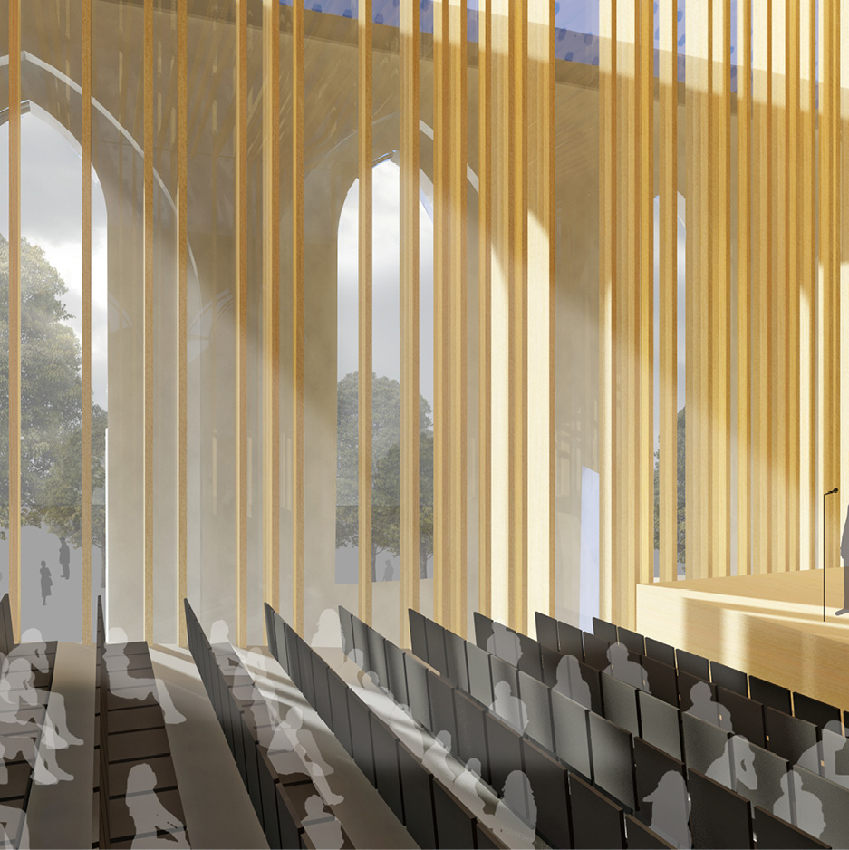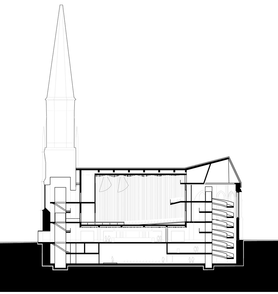 Der Innenraum lebt von dem Kontrast aus gläsernem Kammermusiksaal und massiven Kirchenwänden. Die verglaste Außenhaut nimmt dem Saal optisch sein Volumen und macht den Kirchenraum auch aus dem Saal heraus erlebbar. Die bestehenden Fensteröffnungen der Kirche erlauben zudem Ausblicke in die umgebenden Freiräume wie auch Einblicke ins Gebäude.