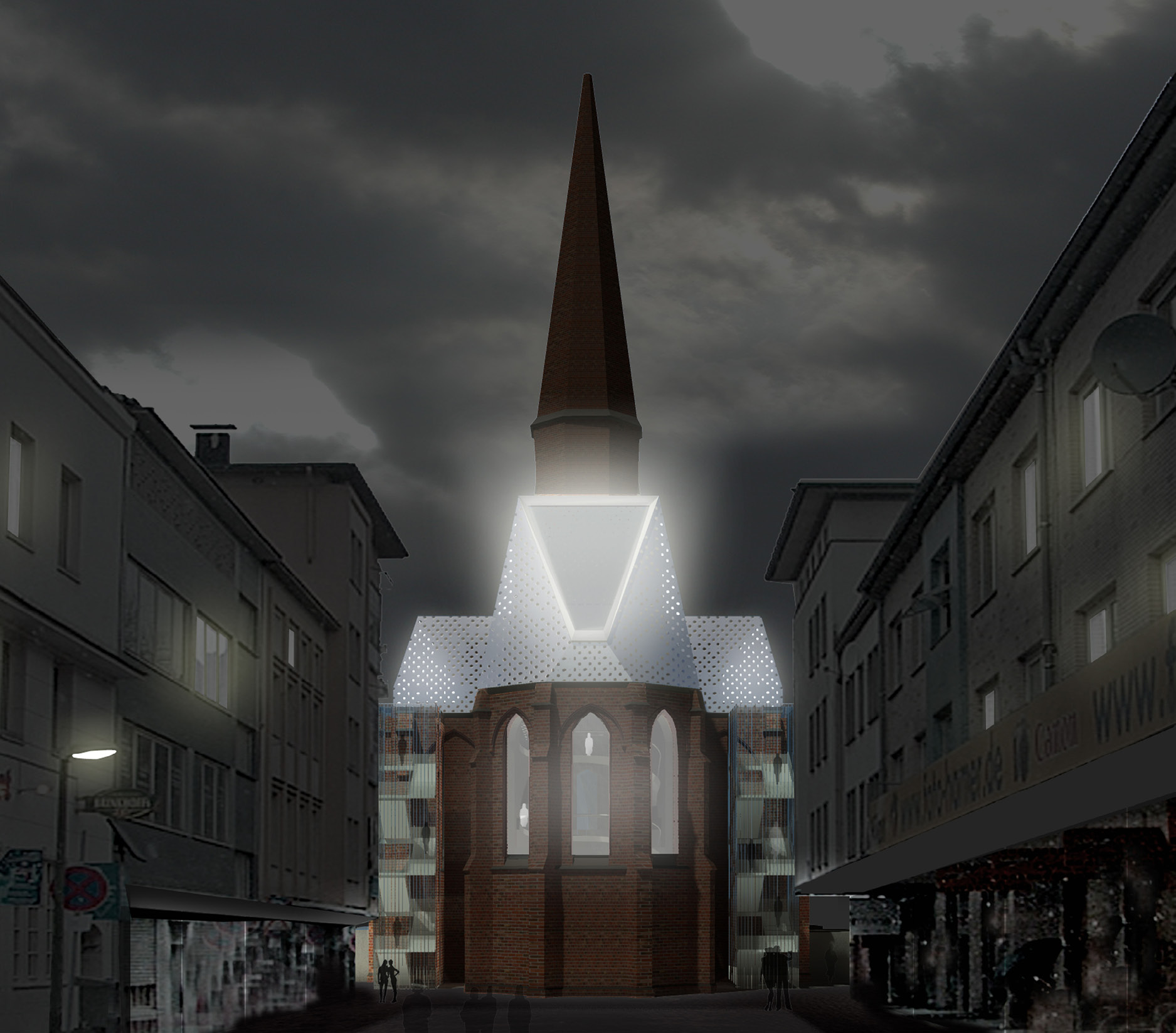 Thema des Entwurfs ist das gleichberechtigte Nebeneinander von Alt und Neu. Das Alte soll bestehen bleiben, wo es keine funktionalen Einschränkungen bedingt. Dort hingegen, wo es aufgrund konstruktiver Mängel ohnehin erneuert werden muss, soll sich das Neue ganz selbstbewusst behaupten, ohne den Bestand in seiner architektonischen Qualität zu beeinträchtigen. Alt und Neu treten in einen Dialog, von dem beide profitieren. Dieser Gedanke manifestiert sich am äußeren Erscheinungsbild der umgebauten Kirche, aber auch im Innenraum.