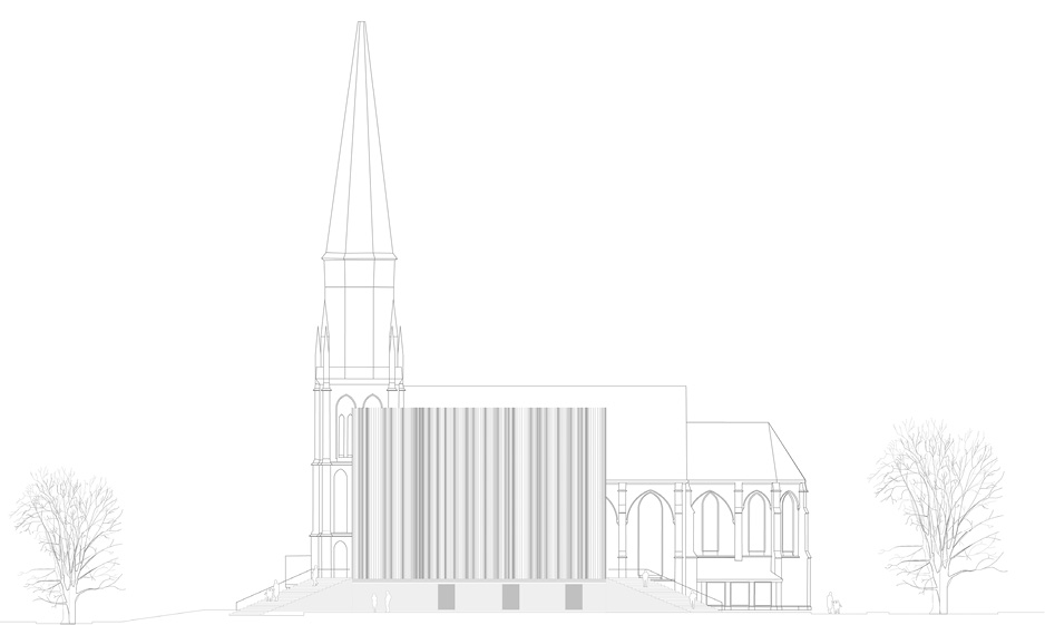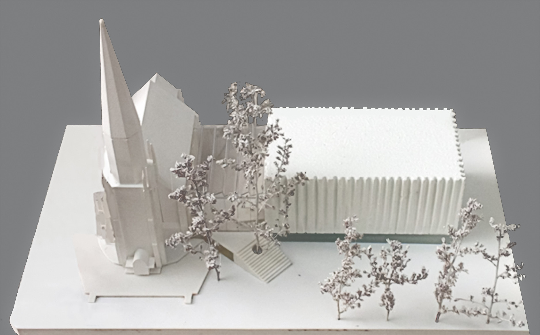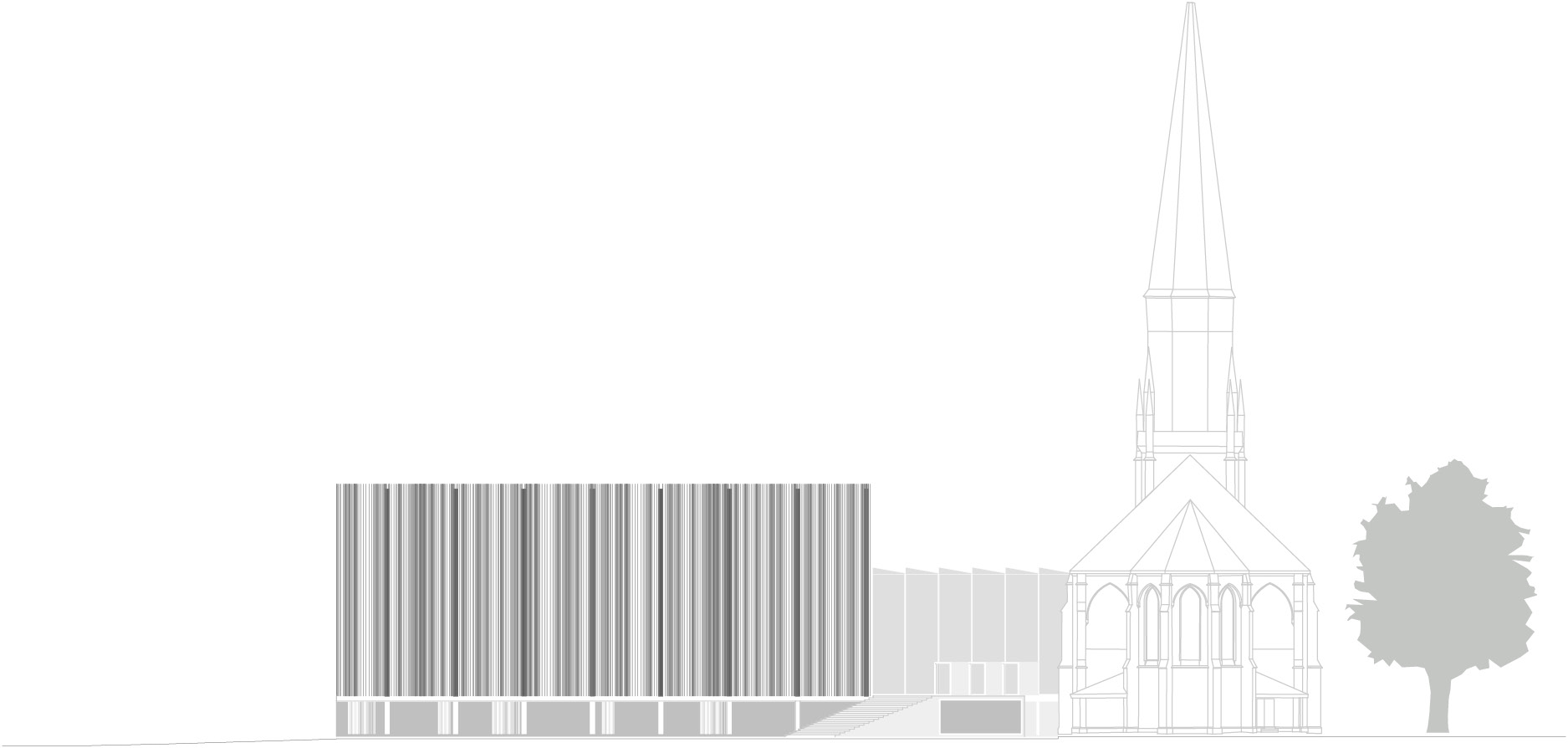 Mit einem schlichten Quader, der durch einen gläsernen Verbindungsbau mit der Marienkirche verbunden ist, reagiert der Entwurf auf die akustischen und ökonomischen Vorgaben für das Musikzentrum. Dabei soll die formale Reduktion in Verbindung mit der völligen Transparenz des Verbindungsbaus die Eigenständigkeit des Kirchenbaus bewahren. Gleichzeitig entstehen mit der Reduzierung der bebauten Fläche auf ein Minimum große Freiflächen, die den neuen Baukörper umspielen und ihn von der Viktoria- wie auch der Humboldtstraße abrücken. Die so geschaffene Distanz soll die Bedeutung des Musikzentrums als wichtiges öffentliches Gebäude innerhalb des Stadtgefüges verdeutlichen. Die resultierenden Außenräume werden gestalterisch aufgewertet und dienen neben ihrer Frequentierung durch Veranstaltungsbesucher auch als Quartiersplatze innerhalb des städtischen Umfelds. Der zur Humboldtstraße gelegene Platz soll zudem als Außenspielfläche genutzt werden.