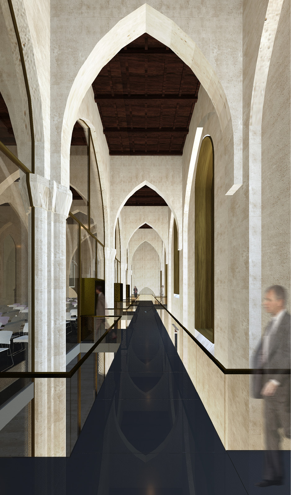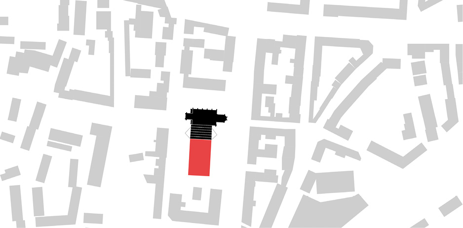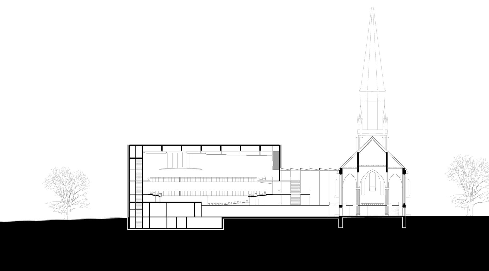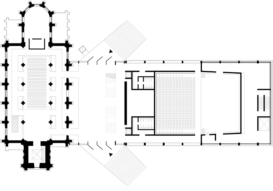 Mit einem schlichten Quader, der durch einen gläsernen Verbindungsbau mit der Marienkirche verbunden ist, reagiert der Entwurf auf die akustischen und ökonomischen Vorgaben für das Musikzentrum. Dabei soll die formale Reduktion in Verbindung mit der völligen Transparenz des Verbindungsbaus die Eigenständigkeit des Kirchenbaus bewahren. Gleichzeitig entstehen mit der Reduzierung der bebauten Fläche auf ein Minimum große Freiflächen, die den neuen Baukörper umspielen und ihn von der Viktoria- wie auch der Humboldtstraße abrücken. Die so geschaffene Distanz soll die Bedeutung des Musikzentrums als wichtiges öffentliches Gebäude innerhalb des Stadtgefüges verdeutlichen. Die resultierenden Außenräume werden gestalterisch aufgewertet und dienen neben ihrer Frequentierung durch Veranstaltungsbesucher auch als Quartiersplatze innerhalb des städtischen Umfelds. Der zur Humboldtstraße gelegene Platz soll zudem als Außenspielfläche genutzt werden.