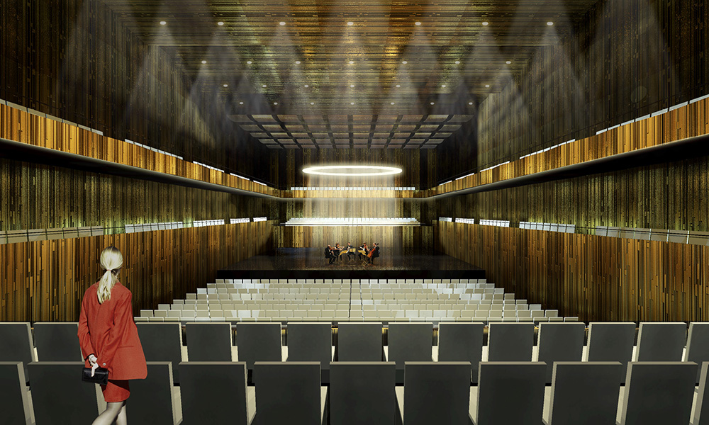 Der Entwurf sieht für die Fassade des Neubaus eine dreischalige Konstruktion mit einer massiven Stahlbetonwand vor. Diese ist außen mit einer unregelmäßig gewellten und durch eine Kupfer-Aluminium-Legierung in Gold leuchtenden Metallfassade verkleidet. Der goldene Farbton soll dem Gebäude eine hohe Wertigkeit verleihen und gleichzeitig Assoziation an Blechblasinstrumente wecken und damit seine Nutzung nach außen hin verbildlichen.