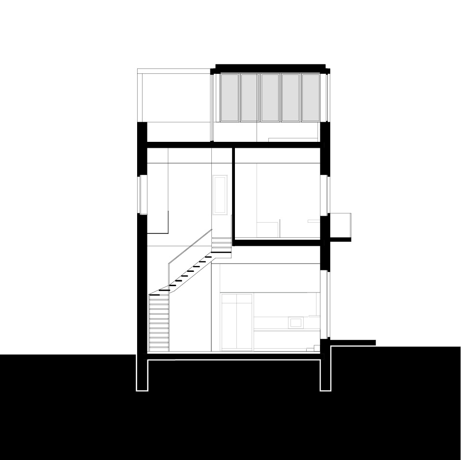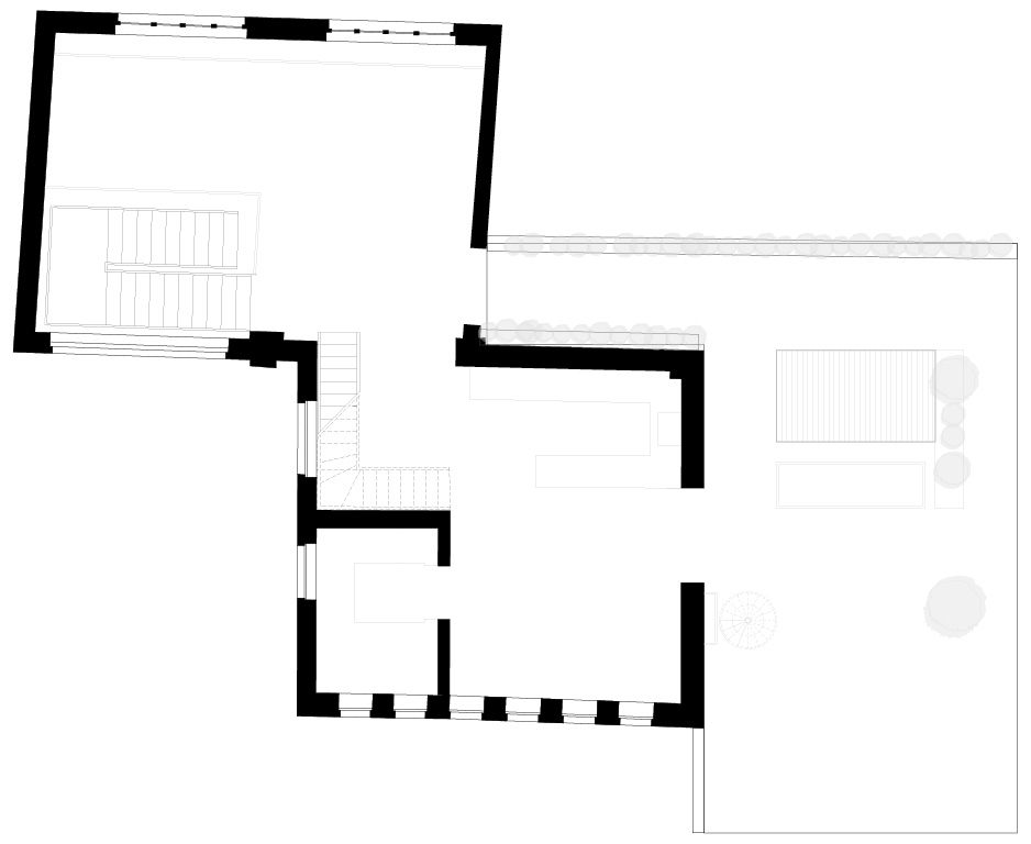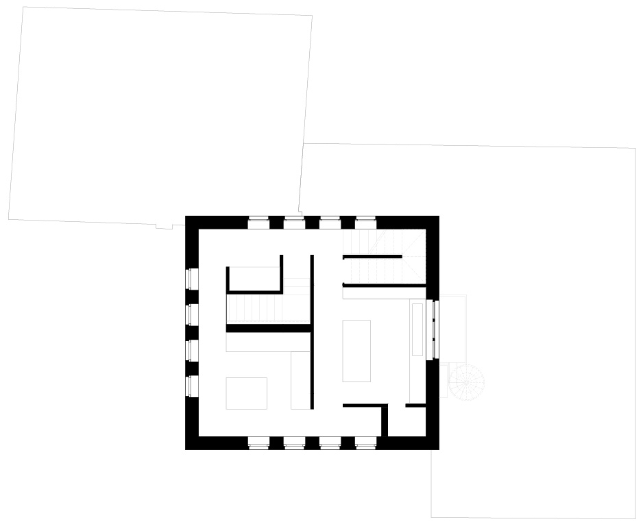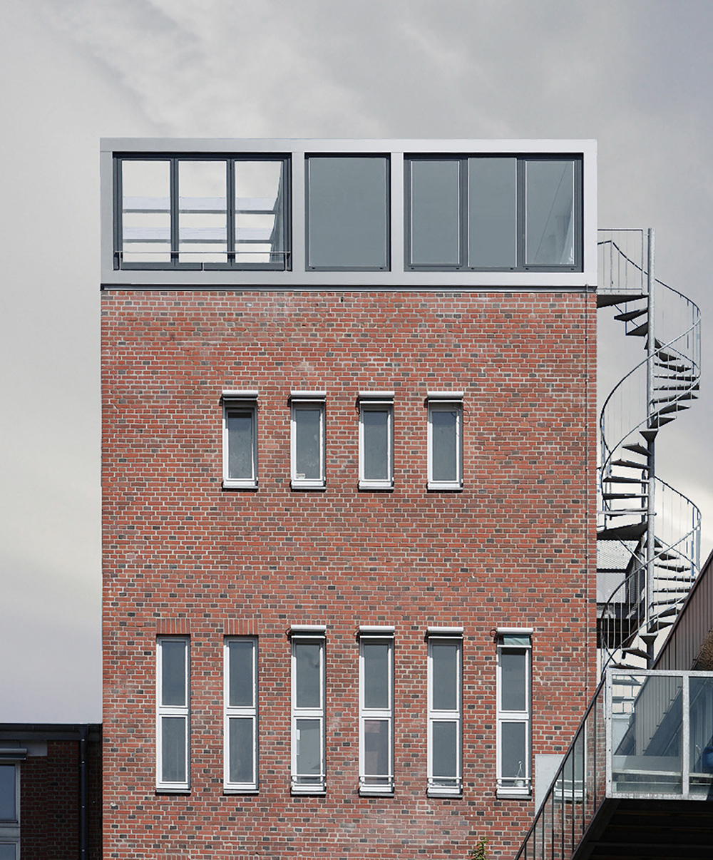 Da der Bedarf nach zusätzlichen Räumen nicht allein durch Veränderungen im Grundriss befriedigt werden konnte, wurde der Turm um eine Etage aufgestockt. Das neue Geschoss setzt sich architektonisch bewusst vom Bestand ab. Der transparente Körper aus Glas und Aluminium bildet einen Kontrast zur Lochfassade der historischen Backsteinarchitektur. Eine kleine Schattenfuge trennt die Aufstockung vom Bestand. Durch das Aufgreifen vorhandener Farben werden Bezüge zum Bestehenden hergestellt und die architektonische Integration erleichtert.