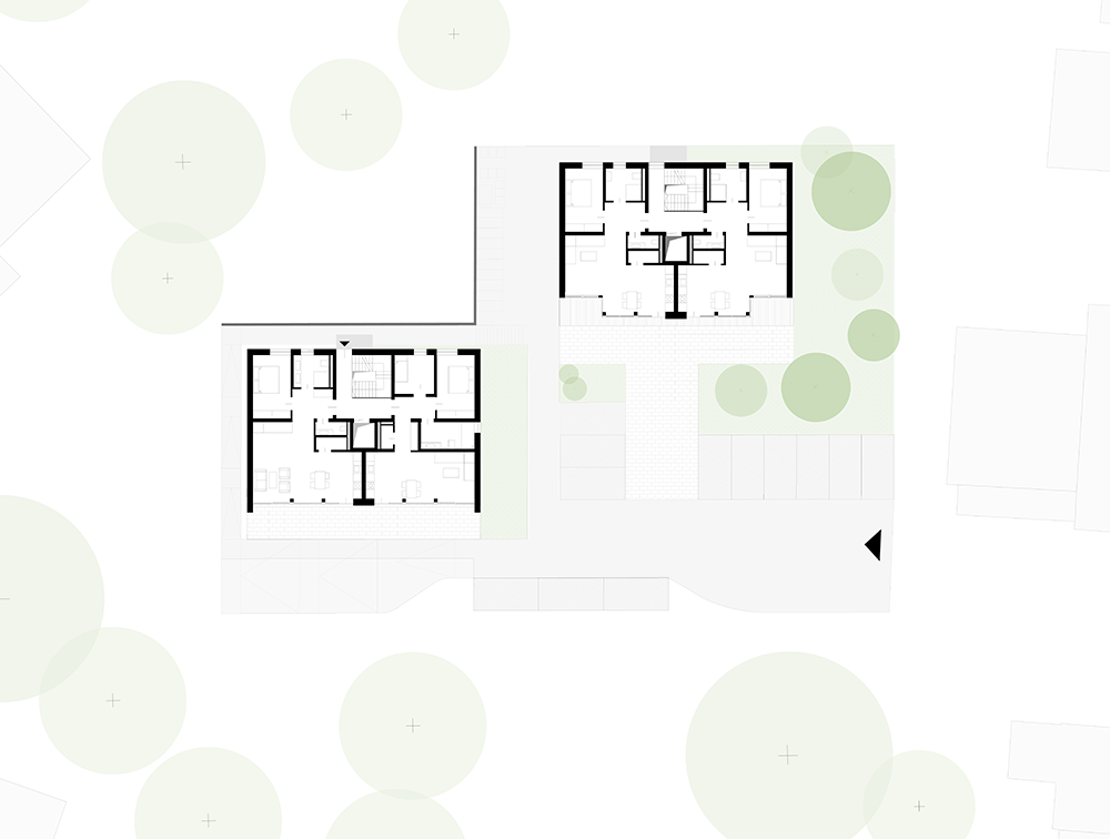 Angesichts der Knappheit von Baugrundstücken auf der einen, und fehlendem Wohnraum auf der anderen Seite ist das verdichtete Bauen eine von mehreren Strategien zur Minderung der Wohnraumknappheit. In diesem Sinne entschieden die privaten Grundstückseigentümer, im hinteren Teil des Grundstücks zwei Mehrfamilienhäuser mit jeweils sechs Wohneinheiten zu errichten.