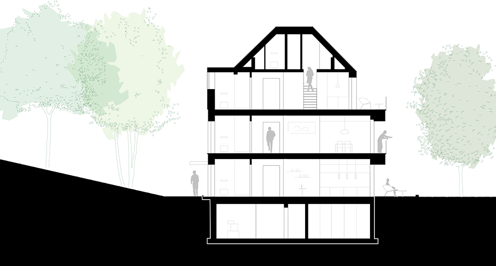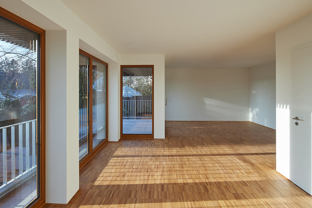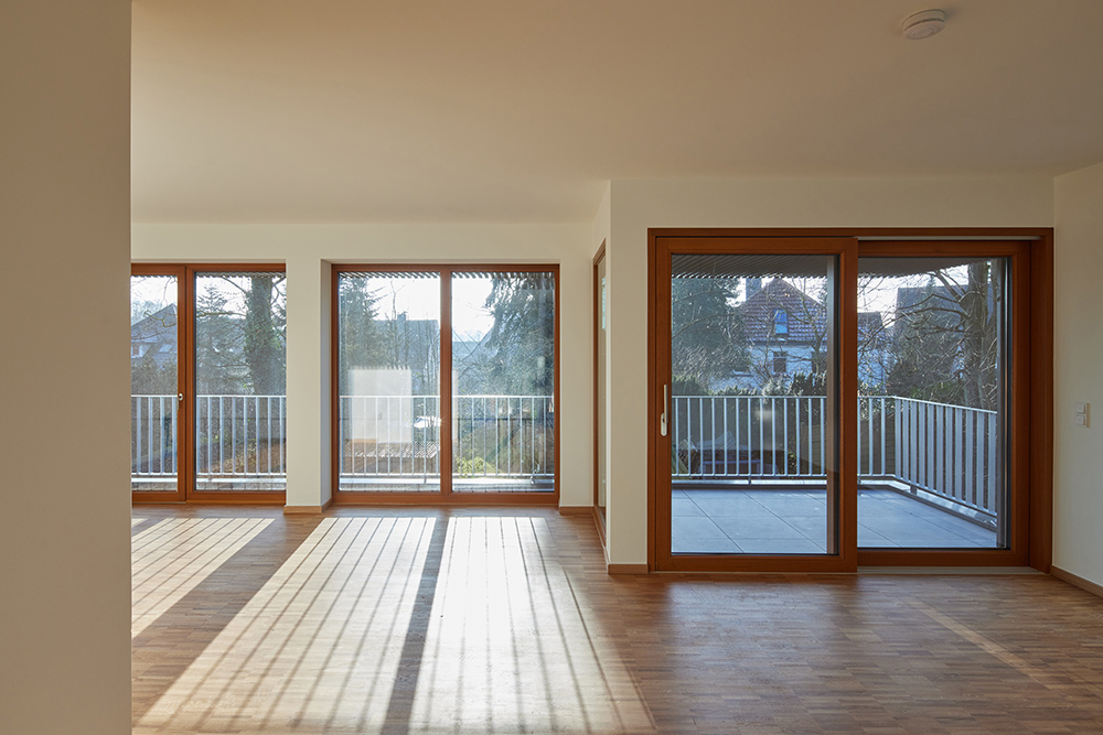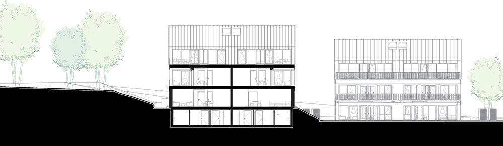 Der Entwurf sieht zwei gegeneinander versetzte dreigeschossige Häuser vor, die einander nicht die Ausblicke verstellen und das Bedürfnis nach Privatheit durch das Vermeiden gegenseitiger Einblickmöglichkeiten befriedigen. Beide Häuser sind als Zweispänner organisiert mit Zwei- und Dreizimmerwohnungen mit Größen von 77 bis 115 m². Die oberen Wohnungen sind als Mezzanine ausgebildet. Die Hauseingänge liegen im Norden, die Wohn-, Essbereiche mit offener Küche im Süden. Letzteren sind sich über die gesamte Hauslänge erstreckende Terrassen vorgelagert.