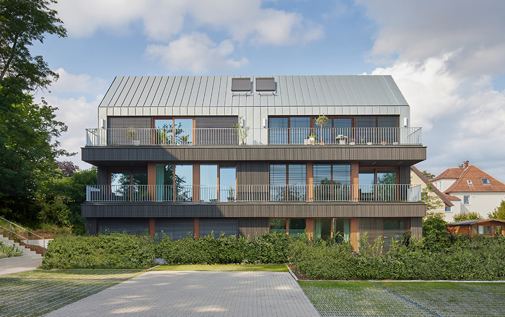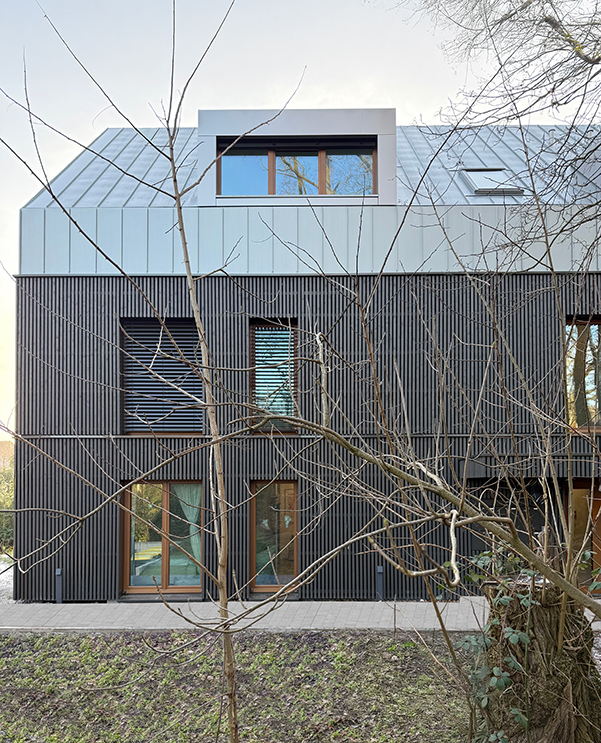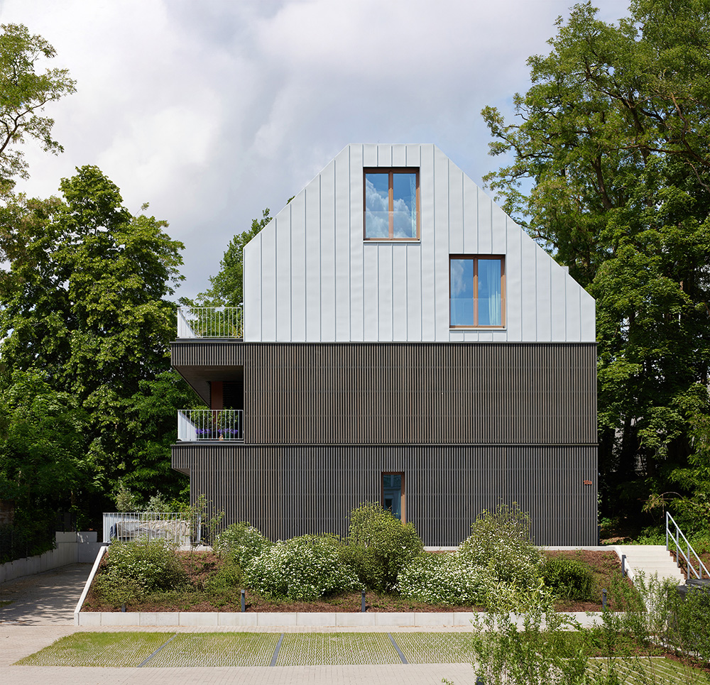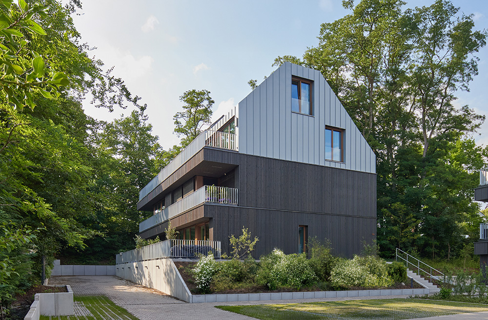 Die Gebäude sind in Massivbauweise errichtet. Die Fassaden der Mezzanine unterscheiden sich von denen der ersten beiden Etagen. Erstere sind aus vorbewittertem Zink, letztere aus kesseldruckimprägniertem Holzlamellen. Die materialseitige Differenzierung gliedert das Gebäude und nimmt ihm optisch seine Höhe. Große Fensteröffnungen lassen im Südenwesten viel Tageslicht in die dort liegenden Wohn- und Essbereiche.