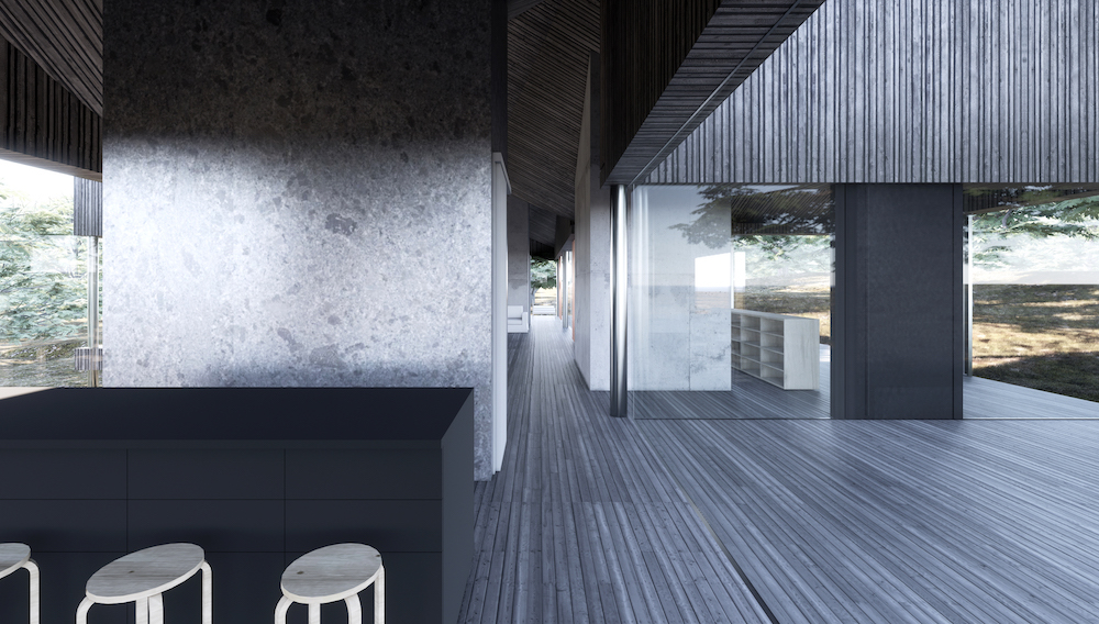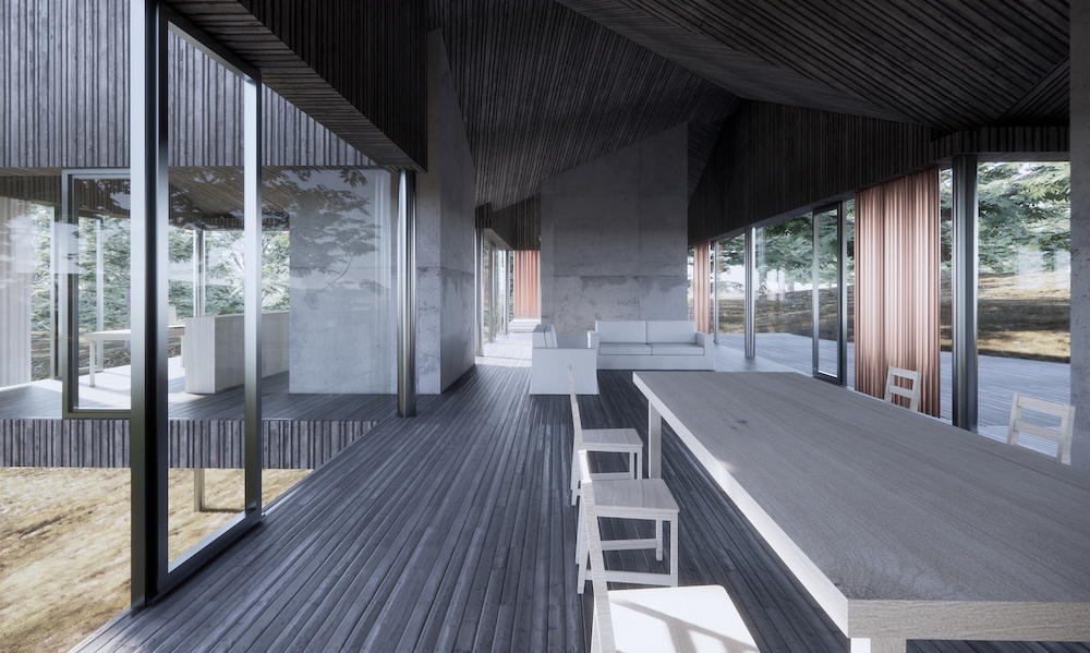 Diese Studie für ein Gebäude auf einem Waldgrundstück hat zum Ziel, durch ein modulares Konzept ein hochflexibles Gebäude zu entwerfen, welches verschiedenartige Nutzungen ermöglicht, in seiner Größe variabel ist und sich so in das bestehende Umfeld einfügt, dass Architektur und Natur eine symbiotische Beziehung eingehen. Das vorliegende Konzept widmet sich zunächst dem Wohnen. Die einzelnen Module sind ohne massive Wände miteinander verbunden. Der daraus resultierende fließende Grundriss bietet ein Höchstmaß an räumlicher Qualität. Die vollständig verglasten Außenwände lassen Innen- und Außenraum miteinander verschmelzen und eröffnen attraktive Blickbeziehungen. Die geneigten Dächer der Module bilden in ihrer Kombination eine gefaltete Dachlandschaft, welche dem Gebäude eine skulpturale Qualität verleihen.