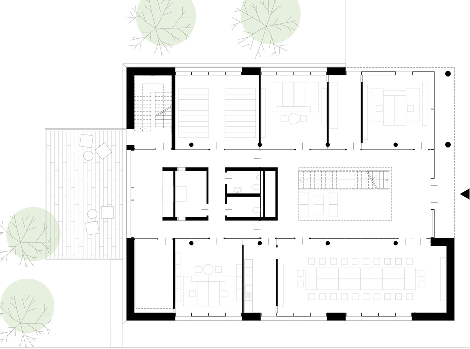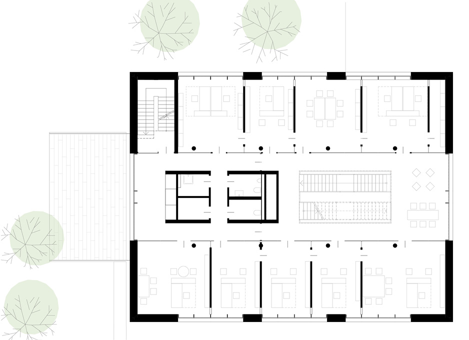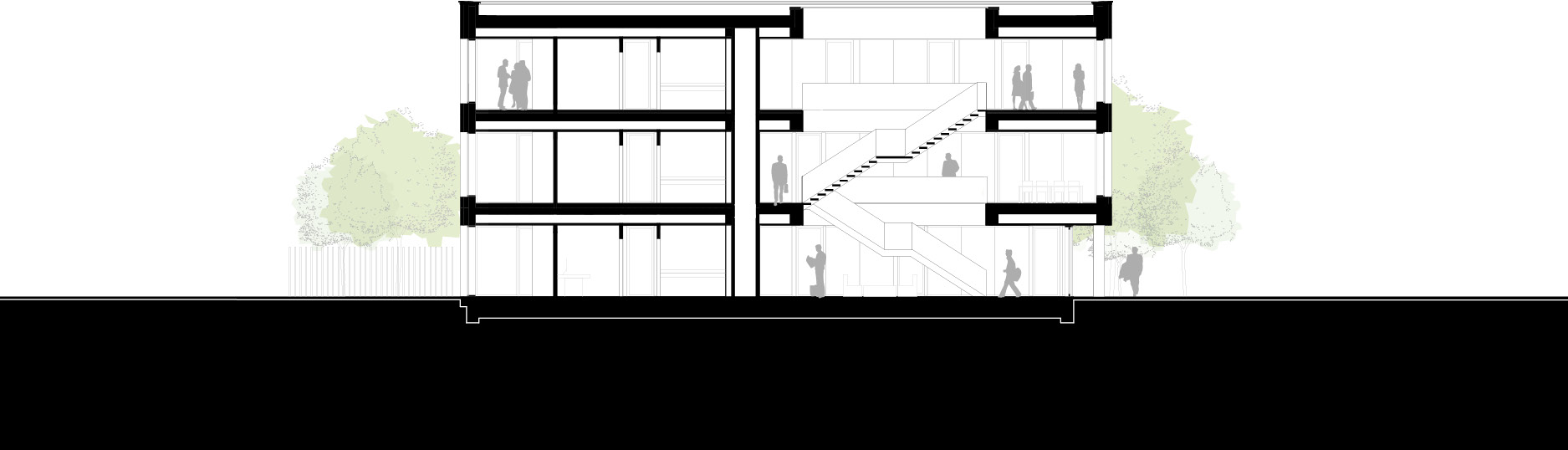 Die Firma Quakernack, ein familiengeführtes Unternehmen der Tiefbaubranche, benötigte ein neues und größeres Bürogebäude als Ersatz für das in den 60er Jahren errichtete Bestandsgebäude. Anders als dieses wurde der neue Baukörper gut sichtbar an die angrenzende Artur-Ladebeck-Straße gerückt, welche eine der Hauptzufahrtsstraßen Bielefelds ist. Das dreigeschossige Gebäude bietet Platz für 25 Arbeitsplätze, 2 unterschiedlich große Besprechungsräume, eine kleine Küche und diverse Nebenräume. Sie gliedern sich um einen zentralen Kern aus Toiletten- und Kopierräumen sowie einen großen Luftraum, in den eine großzügige Freitreppe gestellt ist, welche die Haupterschließung des Gebäudes bildet. Die aufgeweiteten Flurbereiche an den Enden der Mittelzone fördern Austausch und Begegnung und ermöglichen ein soziales Miteinander.