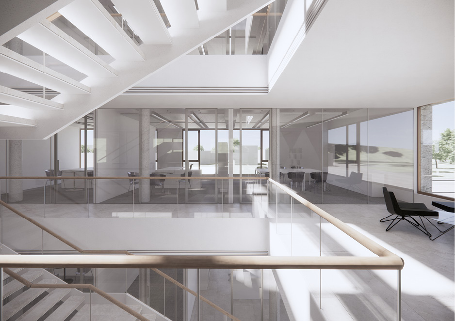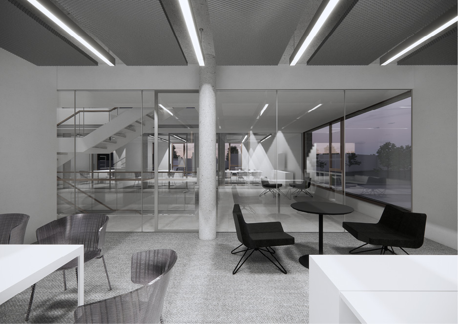 Ein großes Glasoberlicht oberhalb des Luftraums lässt natürliches Licht tief ins Gebäudeinnere eindringen. Die Wände zu den Büros sind komplett verglast. Zwischen diesen sind die Trennwände durch Glasfugen von den Außen- bzw. Flurwänden abgesetzt. So entsteht ein Gebäude von großer Transparenz mit vielfältigen Blickbeziehungen und einer angenehmen Arbeitsatmosphäre. Deckensegel aus Streckmetall unter den Sichtbetondecken absorbieren den Schall und dienen der Heizung und Kühlung der Räume.